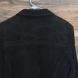 Add a touch of vintage Western flair to your closet with this beautiful black zip-up jacket from Vintage Sportswear. This piece features a soft, suede-like texture (100% viscose) with tonal paisley embroidery on the front pockets and unique decorative stitching across the back yoke.