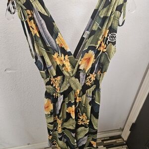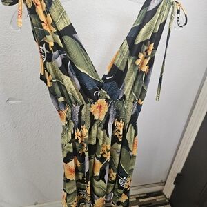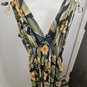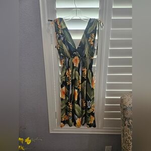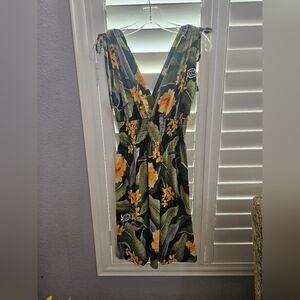 Embrace elegance with this stunning floral V-neck dress. Featuring vibrant orange and green hues, it's perfect for any occasion.