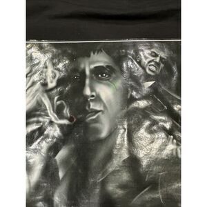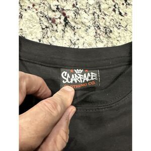 This vintage 90s Scarface Clothing Co T-shirt features a graphic print of Tony Montana, a character from the movie "Scarface." Made of heavyweight cotton in black, this limited edition shirt has a crew neck and short sleeves, with a regular fit in size XL. Perfect for fans of the 90s and vintage fashion.