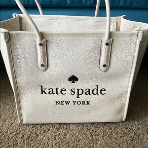 This kate spade tote in a pristine white hue is crafted from textured leather, featuring structured sides and double handles with metallic hardware. The bold black logo against the light background adds a touch of elegance, making it an ideal choice for everyday sophistication.