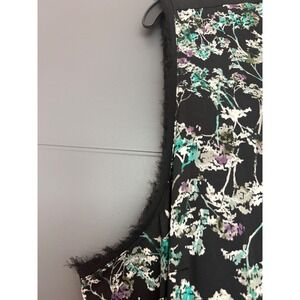 Sleeveless fit and flare dress showcases a vibrant floral print in shades of teal, purple, and white against a black background. Design details include a split V-neckline, a solid black yoke, and delicate eyelash fringe trim at the armholes. A black grosgrain ribbon tie at the waist defines the silhouette, while side seam pockets add practical functionality. The skirt features a subtle high-low hemline for graceful movement. This versatile piece transitions easily from daytime events to evening gatherings.