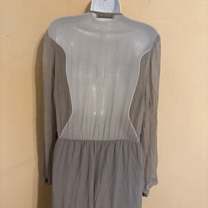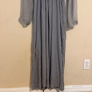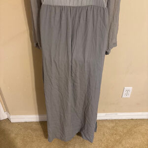 This is a pre-owned Pampelone women's maxi dress in a gray color, size L. The dress features a deep V-neckline and long, sheer sleeves. The bodice is gathered at the empire waist, flowing into a full-length skirt with a high side slit on the left. The fabric appears to be lightweight and somewhat sheer, with a tag indicating 100% Viscose and "Handmade in Indonesia." Visible care instructions include washing in cold water and hanging in the shade. The dress measures approximately 18 inches pit to pit and 56 inches in length. The dress is solid at the front and sheer at the sleeves and back. Perfect for beach and resort vacation wear. Can be worn alone or as a cover up dress.