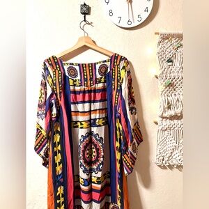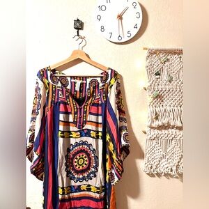 Vibrant boho blouse with geometric patterns. Features a relaxed fit and bold design.