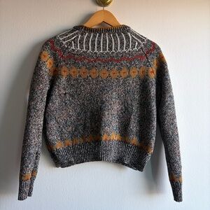 Stylish Zara sweater with vibrant patterns. Features gray, yellow, and red tones. Ideal for cozy outings. Has a small hole in the back, not noticeable.