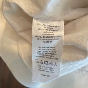 brass buttons, four front flap pockets with snap button closures, drawstring waist, cotton and 3% spandex for a bit of stretch and comfort