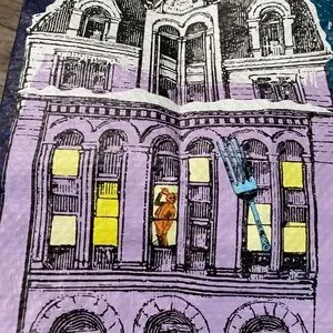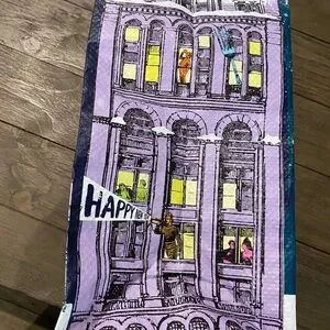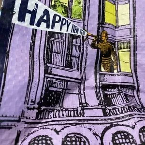 • Detailed Artwork: The side panels (gussets) showcase a charming, hand-drawn style illustration of a city brownstone with neighbors celebrating and blowing New Year's horns.