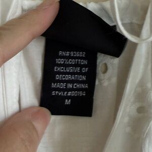 100% Cotton, has pockets. Adjustable straps at neckline that tie in the front