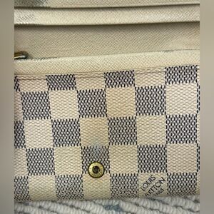 This is an authentic LOUIS VUITTON Damier Azur Port Monnaie Billets Tresor Wallet. This is a stylish compact wallet that is crafted of classic Louis Vuitton Damier check coated canvas. The front flap opens to a white cross grain leather interior with patch pockets, card slots, and a zipper coin compartment.