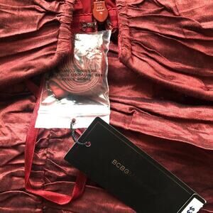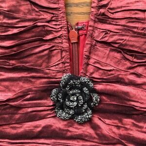 Strapless dress featuring removable adjustable straps, plunging neckline, black crystal rhinestone brooch, hidden back zip with closure. Metallic red pink w/ ruched fabric with some give.
