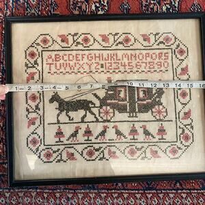 Framed Cross Stitch Embroidered Sampler Red/Black Stage Coach Horse & Driver