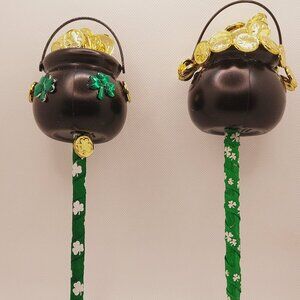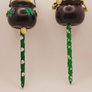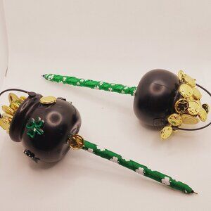 This St. Patrick's Day One-of--a-kind St. Patrick's Day writing pen and holder set makes a great idea for work, home or as a gift. One pen writes with black ink, has a black pot with green shamrocks on the outside and hand filled with gold coins in pot, the second pen writes in blue ink, has a solid black pot hand filled with gold coins. The Pot of Gold are both one-of-a-kind and a great gift. The pen holder is dark green with wide burlap style ribbon featuring clovers and white daisies on ribbon, the large shamrock on ribbon has gold-colored dots, two stripped ribbons in white, green & gold wrapped around holder with two small gold shamrock coins, with a gold-colored horseshoe charm on back of ribbon. This is a unique and great gift to gift today.