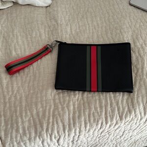 Chic black clutch with striking red and green accents. Includes a matching wristlet strap. Ideal for versatile styling.