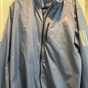 Three Adidas jackets. Features blue and black colors. Stylish and versatile.