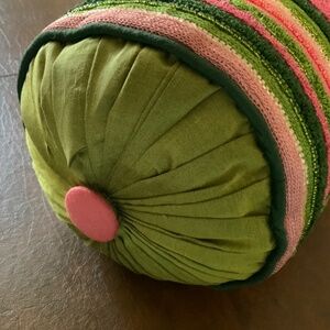 Vibrant bolster accent pillow with green and pink stripes. Features a plush green end with a pink button detail. Perfect for adding a pop of color.