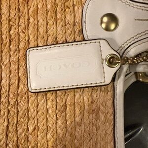 Branding: The "Coach" name is embroidered in script on the straw body.