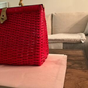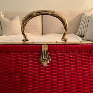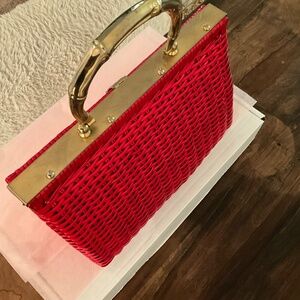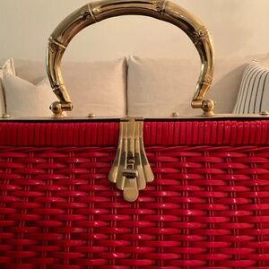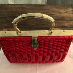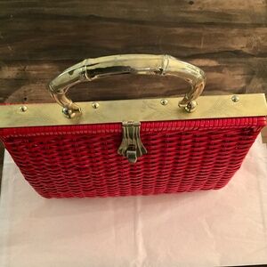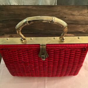 Vintage red intricately designed purse adorned with semi- scalloped gold fasten enclosure with bamboo inspired brass handle, with brass engraved detailing on the top. The only comparable one ive found is just under $400.00. And this one is more beautiful due to brass embellishments and vibrant red color. Beautiful for Spring/Summer. Great full size. Excellent condition.