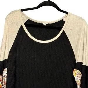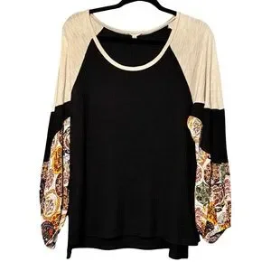 Umgee Oversized Waffle Knit Ballon Sleeve Mixed Media Bohemian Blouse Top