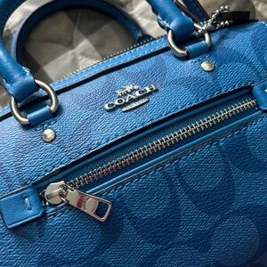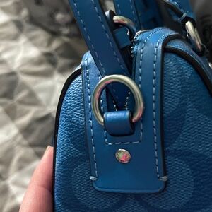 Coach mini handbag with signature logo. Vibrant blue color. Perfect for any outing. Comes with adjustable shoulder strap.
