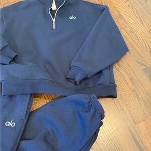 Stylish Alo tracksuit set in navy blue. Features a zip-up top and matching pants. Perfect for casual wear.