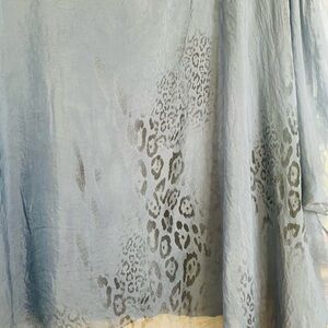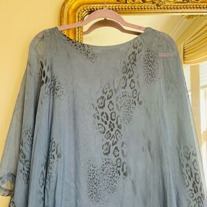 Chic blue blouse with sheer fabric. Features subtle animal print.
