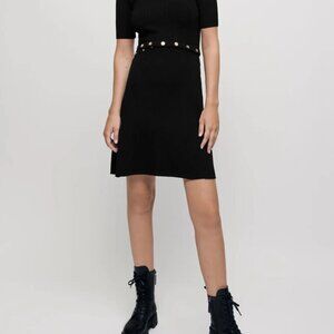 Size 38. Short, straight dress, slightly fitted at the waist. Stretch ribbed knit. Short, straight sleeves. Low stand-up collar. Maje-branded metal buttons on the waist. The top and skirt can be detached to be worn separately. Ref: MFPRO01973 Sofia is 180 cm and is wearing a size 36 The viscose in this garment is FSC certified. This means we can be confident that the wood pulp comes from sustainably managed forests, where care and attention are given to biodiversity and indigenous populations and anti-deforestation measures are in place. At Maje, we imagine the future. Our common goal is to reduce the environmental impact of our clothes a little more every season. Read about all the steps we are taking • Short, cinched-in dress • Ribbed stretch knit dress • Dress with low stand-up collar • Black dress Reference: MFPRO01973