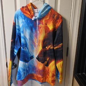 Vibrant hoodie featuring a striking wolf graphic in blue and orange tones.