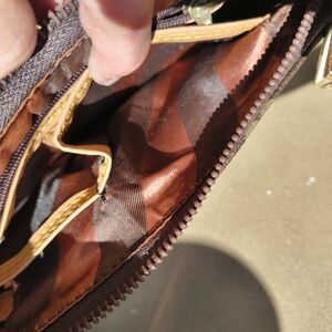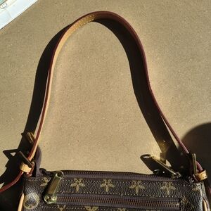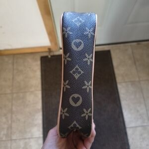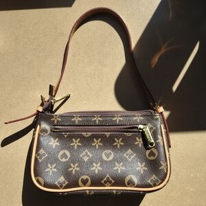 Elegant brown shoulder bag with a classic monogram design, a mock LV. Perfect for any occasion. No wear on the bag, inside, or straps at all. Bag measures 8"x4.5"x2.5" strap is 9" but can be adjusted another 2-3" longer. This small purse is so beautiful.