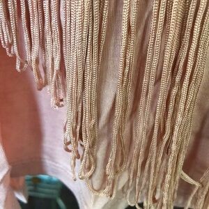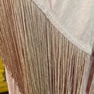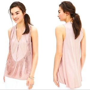 NWOT and never worn or washed. Banana Republic V-neck sleeveless top with cascading fringe yoke. This is a beautiful top in a light dusty rose color. Ultra soft and flows so beautifully! Sleeveless with deep v-neck. Subtle hi-low hem. Long, cascading matching fringe lines the entire front neckline. A lovely, versatile top. Does have some horizontal stretch. Lightweight fabric. Some wrinkles in the pictures from being folded.