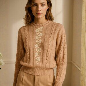 This dreamy vintage sweater by Liz Claiborne Collection captures the romantic charm of late-’80s quiet luxury. Knitted in a soft blush hue with a creamy floral vine motif down the center, it combines delicate femininity with timeless craftsmanship. The blend of lambswool and angora gives it a plush, haloed texture and gentle warmth, while the cable-knit ribbing elongates the silhouette for an elegant fit.