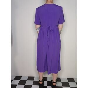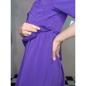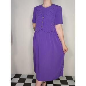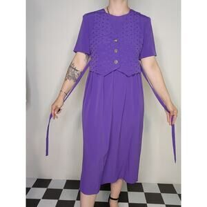 Vintage 80s 90s Leslie Fay NWT New With Tags Purple Vest Button Up Coquette Dress. This dress appears to be a two piece, but is actually a one-piece. The vest is just for show in the front and is attached to the dress. The buttons are also just for show. This dress does tie in back, so you can cinch the waist.