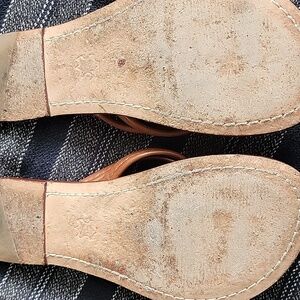 Classic leather sandals in dark tan are equally well suited for the beach or the cafe. With padded soles and double straps, you'll feel secure and comfortable all day. If my right foot hadn't decided to grow, I'd keep them my entire life, as they are beautifully crafted and timeless.