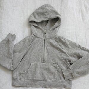 Cozy gray hooded sweatshirt featuring a half-zip design and front pocket. Size XS/S. In good condition