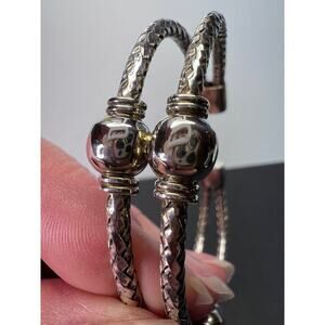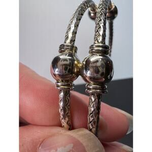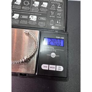 This is sterling silver throughout. It’s flexible so you can squeeze it tighter around your wrist or bend it back to remove. Would fit for different size wrists. Total weight is 24.04 grams