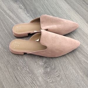 Elegant blush suede mules for versatile style. Comfortable slip-on design.
