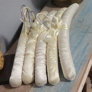 Enhance your closet with these 5 elegant cream satin padded hangers. Perfect for delicate garments, these hangers add a touch of luxury to your wardrobe.