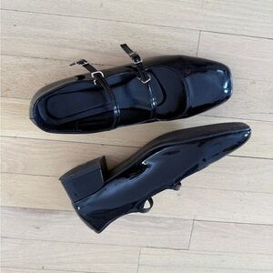 Black patent leather Mary Jane shoes. Perfect for any occasion, they offer both comfort and sophistication.