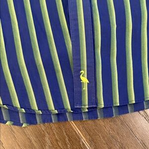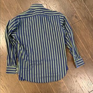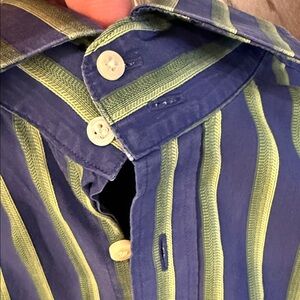 Stylish navy and lime stripes. Casual button-down design. Perfect for versatile wear.