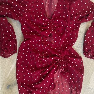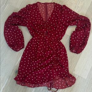 Stylish red dress with white polka dots and a chic cutout design. Features long puff sleeves and a flattering fit.