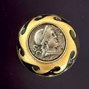 Style: The design is directly inspired by ancient Greek and Roman motifs, specifically featuring a silver-tone replica coin with a profile bust (often a "Roman Emperor" or "Roman Cameo") set within a gold-tone, round frame.