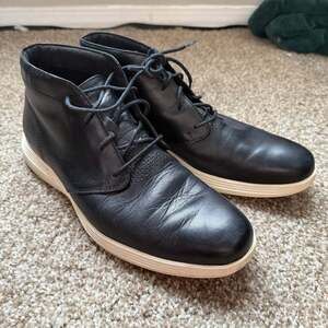 Cole Haan Grand Tour Chukka Boots in black leather, men's size 9. These stylish and comfortable boots feature a classic chukka design with a modern Grand. os sole for enhanced comfort and flexibility. Perfect for both casual and semi-formal wear. Good pre-owned condition with some wear on the soles and creases in the leather, as shown in the photos. Made in Vietnam.