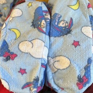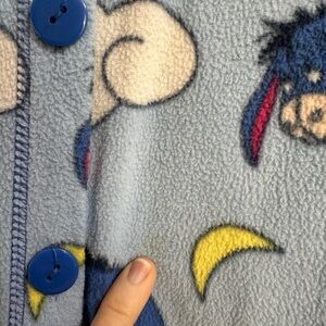 This adorable blue one piece features a fun Eeyore print. Light fleece fabric with button front. One small discoloration at the front as pictured. Untreated. Grip on the bottoms of the feet is starting to wear and some discoloration on bottoms of feet as well.
