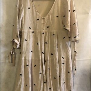Elegant cream dress with black embroidered accents. Features a V-neck and button details. Perfect for casual outings.