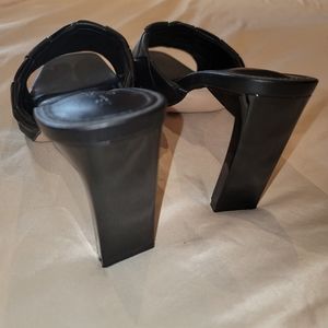 Black sandals with an open-toe woven front and trendy skinny heel. Extra padded insole. Only worn once.