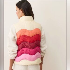 Beautiful Marine Layer puffer vest in one of their iconic sunset designs. Cream with shades of pink, red and coral.