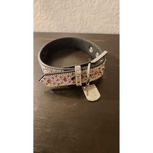 Jacqueline Kent JK9 Diamonds in the Ruff dog collar features a stunning array of pink and iridescent crystals in a geometric diamond pattern. Crafted from black pebbled faux leather, this glamorous accessory includes a silver-tone buckle, a sturdy D-ring for leash attachment, and a signature "Diamonds in the Ruff" metal tag. The shimmering rhinestones provide a high-fashion look for your pet, perfect for special occasions or everyday luxury.