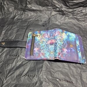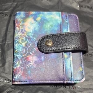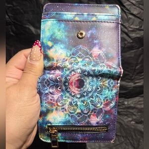 This vibrant wallet features a stunning galaxy print, perfect for adding a pop of color to your accessories. The black strap adds a sleek touch, making it both stylish and functional.
