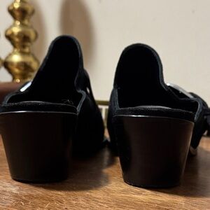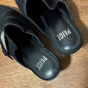 PAIGE Kensington Mule contrast topstitching with a metal toe rand and an etched buckle it adds a Western flair to this pointy-toe mule. Sizing: True to size - Pointed toe - Slip-on - Lightly padded footbed - Stacked block heel - Approx. 2.25" heel - black suede. In excellent pre-owned conditions. Size 8