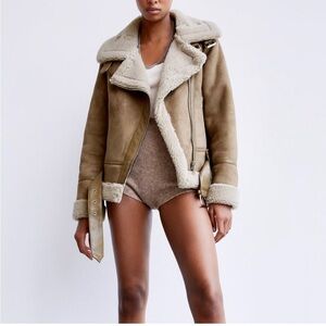 Zara trendy tan beige aviator faux suede Sherpa shearling moto jacket size S