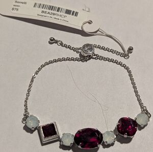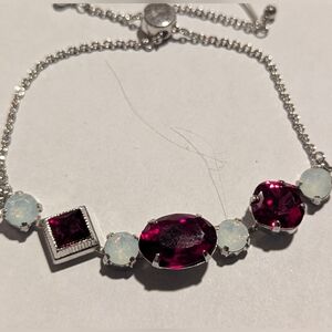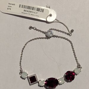 Dazzling bracelet by Sorrelli. Features vibrant red and white gemstones. Set in a sleek silver chain. Perfect for any occasion.