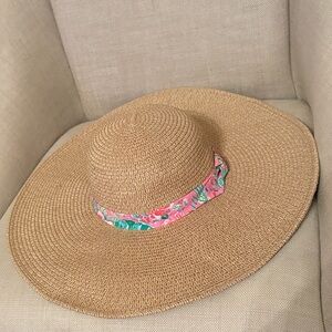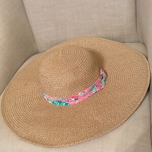 NWOT Lilly Pulitzer Stylish straw hat with a pink floral band. Patterns journey to the jungle. GWP Ideal for sunny outings.Never worn kept in closet. Smoke free home.